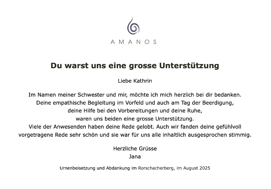 Ich absolvierte eine Ausbildung zur Lebens- und Trauerbegleiterin und spezialisierte mich auf die Begleitung von Kindern und Familien. Einen Tag pro Woche arbeite ich seither als Trauerrednerin und -begleiterin bei einem Bestattungsunternehmen in Thun.