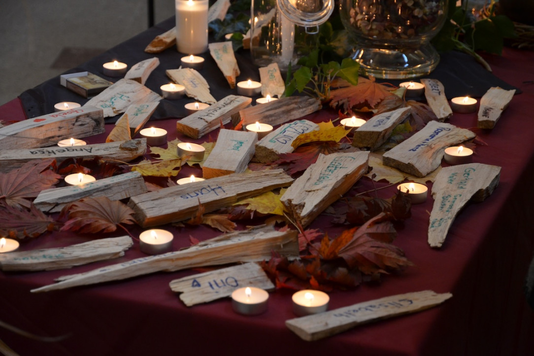 Ein erster Schritt hinein in die gemeinsame Erfahrung schon beim Eintreten: Aus einem Korb ein Stück Holz auswählen, darauf den Namen des Menschen schreiben, dem an diesem Nachmittag gedenkt werden wollte. Ein stiller, persönlicher Moment.